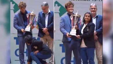 கார்ல்சனின் கால்களை தொட்டு வணங்கிய இந்திய வீராங்கனை